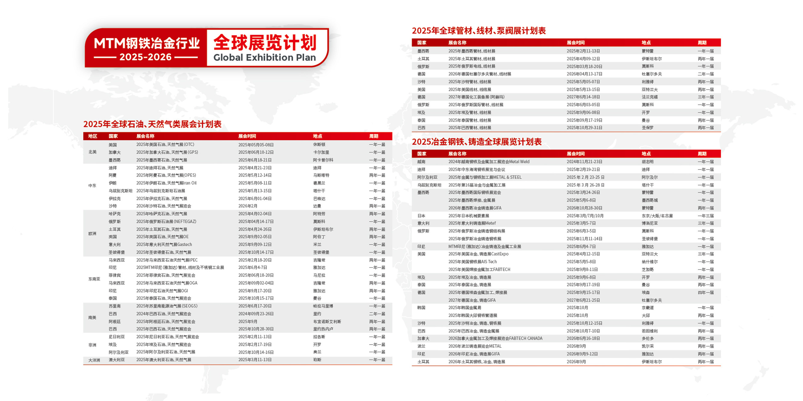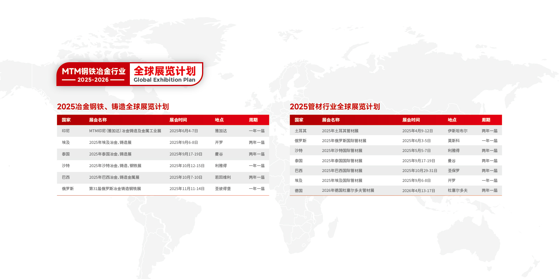 MTM金屬世界博覽會源自創(chuàng)辦于1986年的上海國際冶金工業(yè)展覽會。經(jīng)過30多年的發(fā)展,形成了冶金展、耐火材料展、鑄鍛造展、鋼管工業(yè)展、金屬線材展、工業(yè)爐熱工展、有色金屬展七大主題展的鋼鐵冶金全產(chǎn)業(yè)鏈一站式采購平臺。2025年,MTM金屬世界博覽會將以“科技創(chuàng)新、綠色低碳、智能制造、高效集約” 為主題,聚焦未來鋼鐵產(chǎn)業(yè)發(fā)展變革之路,分享行業(yè)技術(shù)創(chuàng)新成果與實(shí)踐。為全產(chǎn)業(yè)鏈可持續(xù)發(fā)展增添動(dòng)力。